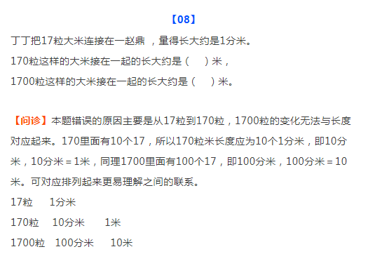 【问诊】本题出错的原因主要有:1.容易只关注单位,而不能数值与单位一起看具体的长度;2.单位换算的方法不熟练。根据长度单位之间的进率,借助数的组成理解单位换算的方法,将4个不同单位的长度转换为同一单位的长度。3米=3000毫米,32分米=3200毫米,4厘米=40毫米,所以4厘米<47毫米<3米<32分米。