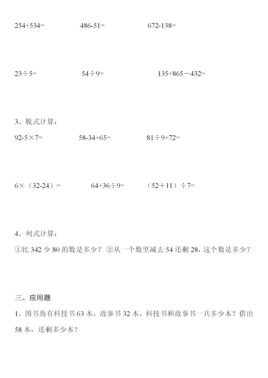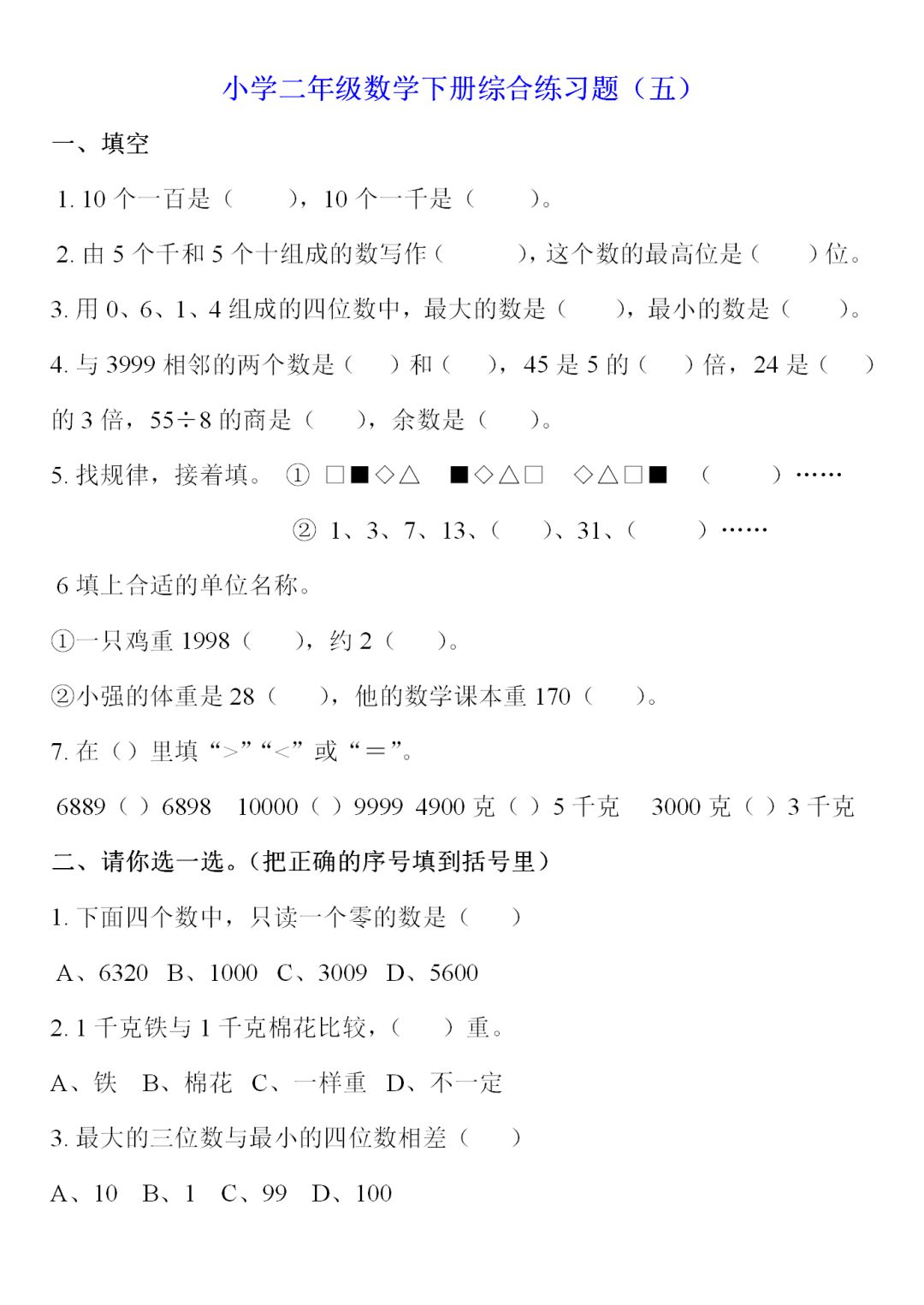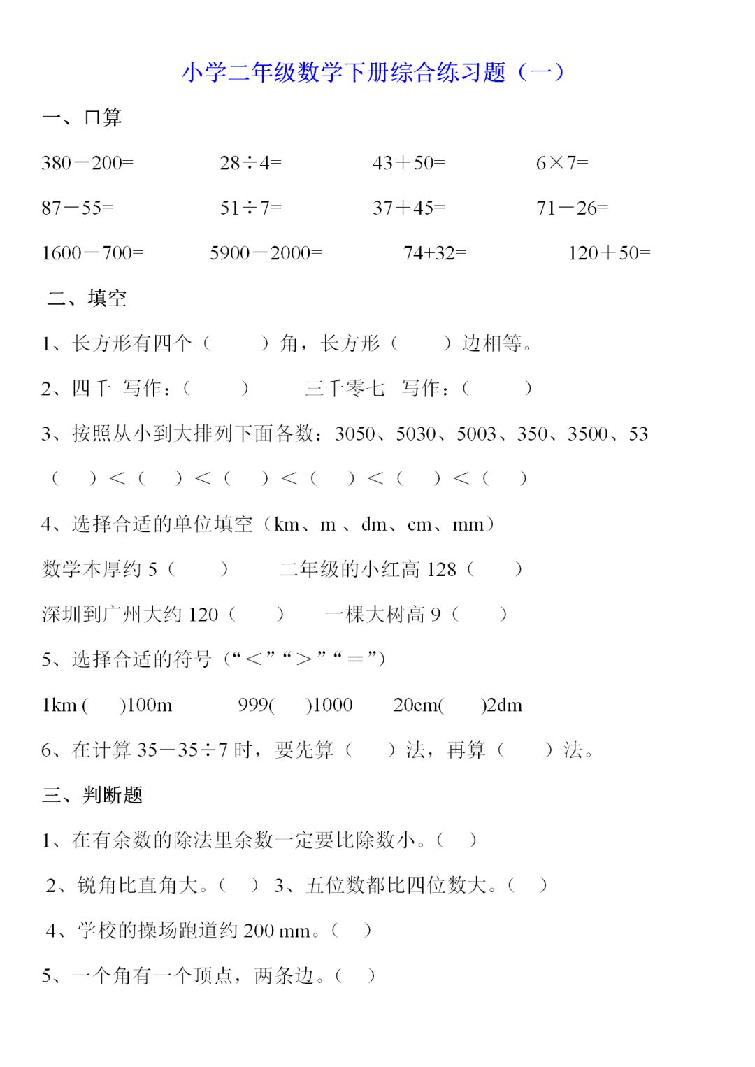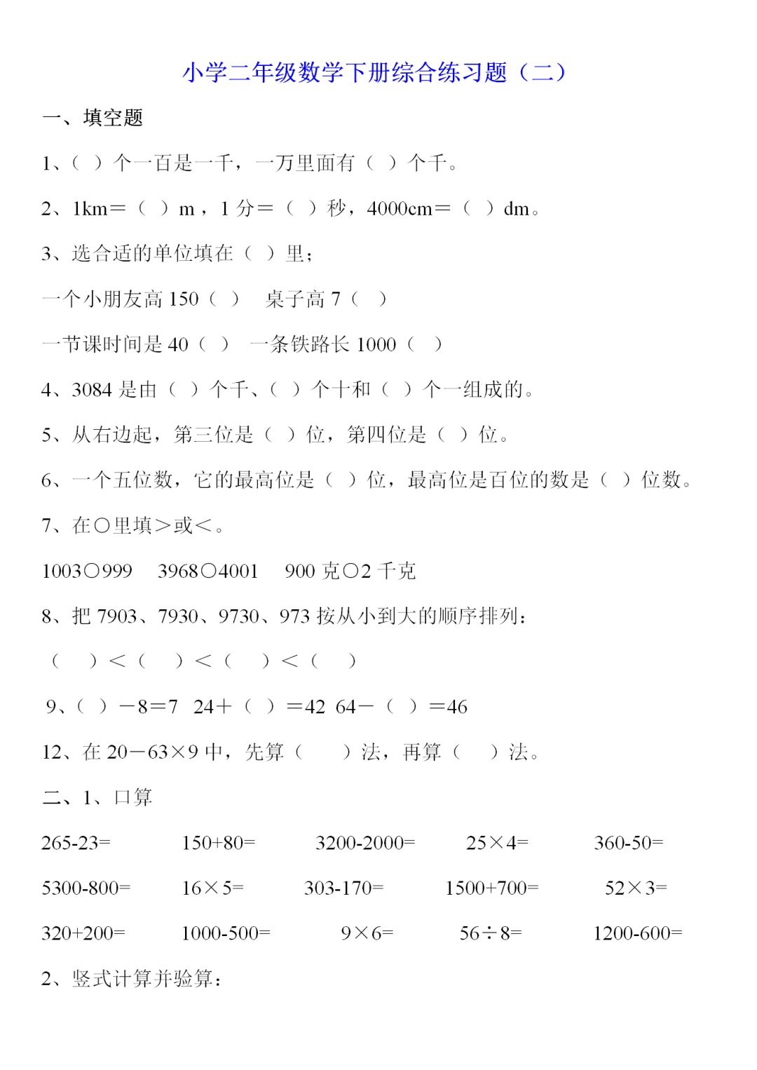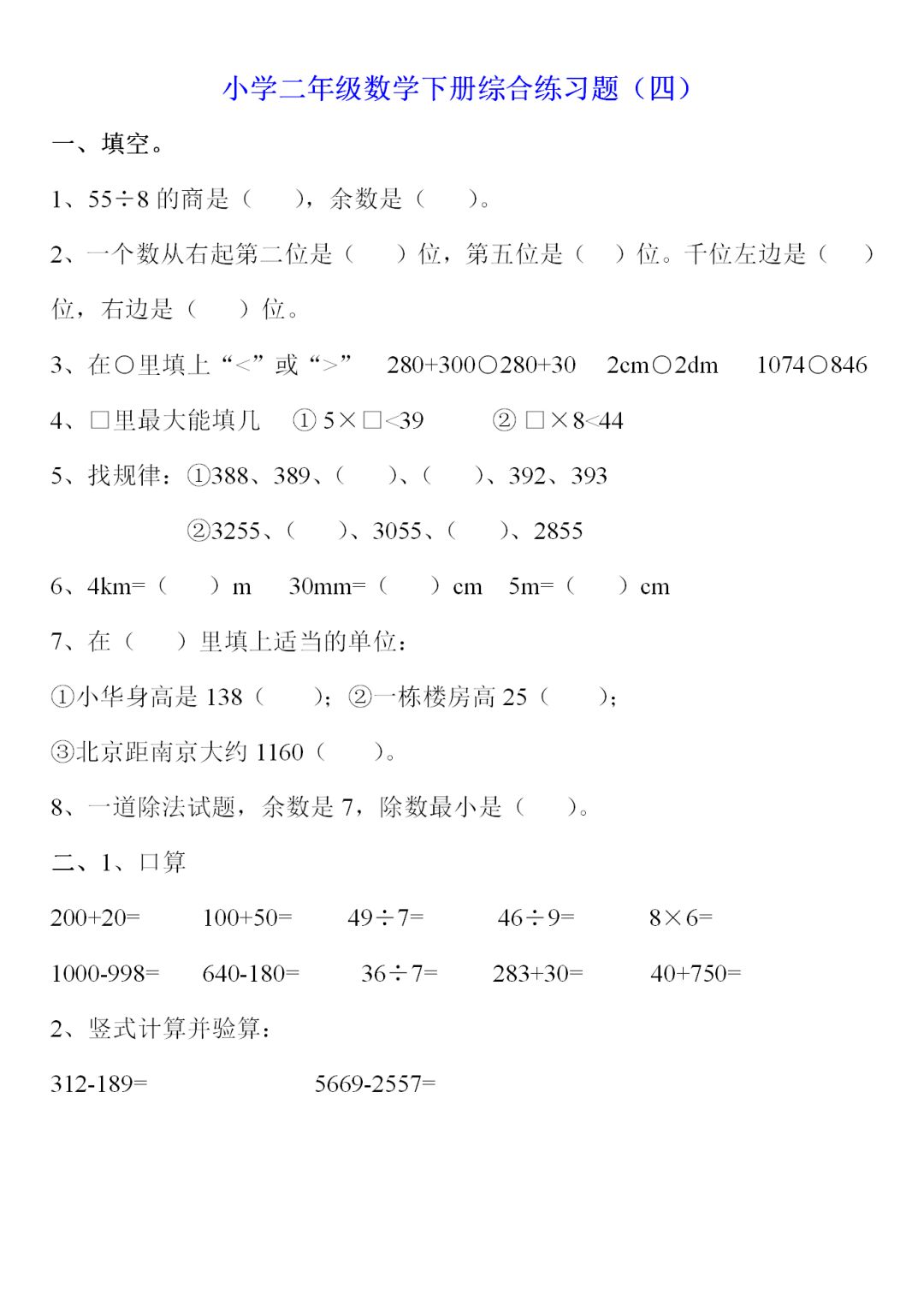 人教版二年级数学下册综合练习题9套,电子版可