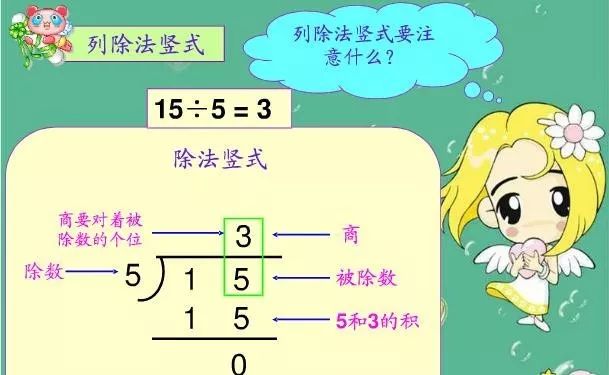 1、除号写端正,数位要对齐,被除数里面藏,除数对面站,商在上面看。