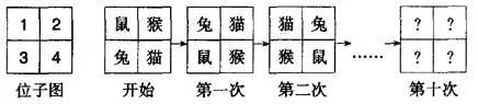 10.四个小动物排座位,如下图:一开始,小老鼠坐在第1号,小猴子坐第2号,小兔坐第3号,小猫坐第4号.以后它们多次地交换位子:第一次上下两排交换,第二次(在第一次交换之后)左右两列交换,第三次上下两排交换,第四次左右两列交换,……这样换下去,问:第十次交换后,小兔子坐在第几号位子上?