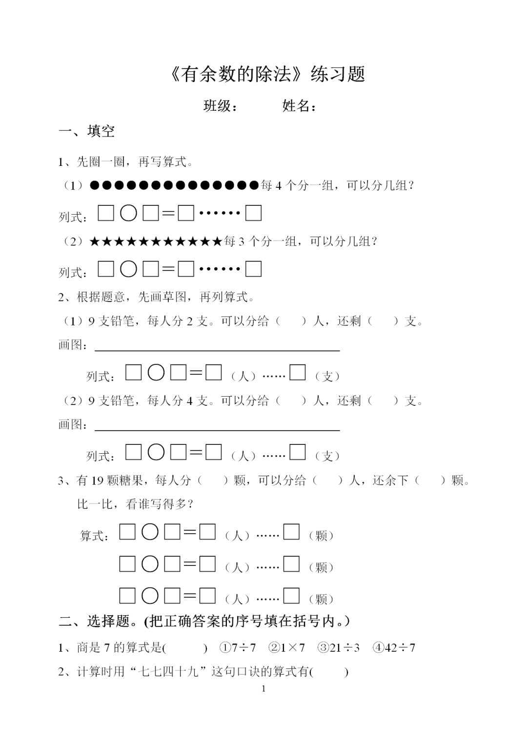 二年级数学下册《有余数的除法》课件+练习题,