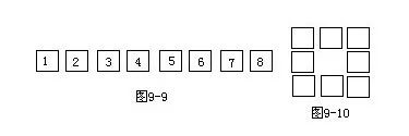 如下面图9—9所示有八张卡片.卡片上分别写有1、2、3、4、5、6、7、8八个数.现在请你重新按图 9—10进行排列,使每边三张卡片上的数的和等于:①13,②15.