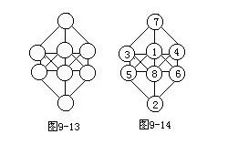图9—13是由八个小圆圈组成的,每个小圆圈都有直线与相邻的小圆圈相接连.请你把1、2、3、4、5、6、7、8八个数字分别填在八个小圆圈内,但相邻的两个数不能填入有直线相连的两个小圆圈(例如,你在最上头的一个小圆圈中填了5,那么4和6就不能填在第二层三个小圆圈中了).
