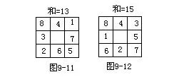 可以看出,因为8+7=15,所以8和7不能填在同一边,也就是说,要把8和7分别填在相对的两个角的方格里,如图9—12所示.