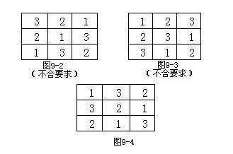 解:这样想,如果每行的三个数分别是1、2、3,每列的三个数也分别是1、2、3,那么自然满足每行、每列的三个数之和相等这个条件的要求.试着填填看.有图9—2、图9—3和图9—4三种不同的填法,检查一下,只有图9—4的填法,满足对角线上的三个数之和与每行、每列三数之和相等这个条件的要求.