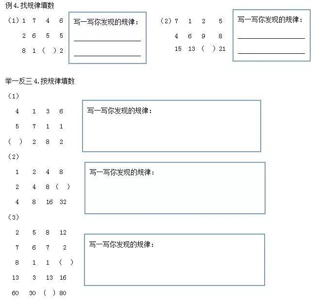 我们经常看到按一定规律排列起来的一列数,如果要在一列数后面再续写几个数,就要仔细观察这列数中已经出现的几个数之间有没有规律,找准了规律,就能按照规律填数了。