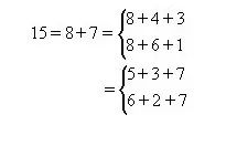 ②要使每边三张卡片上的数相加之和等于15时,就要将15分拆成三个数之和: