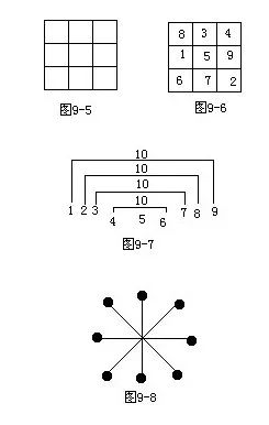 解:从1~9这九个数字中,5是处于中间的一个数,而4与6,3与7,2与8,1与9之和都正好是10.所以5应当填在中心的空格中,而其他八个数字应当填到周边的方格中.上面图9—6就是一个符合要求的解答,把5填在中心空格后,尝试几次是不难得出这种答案的.