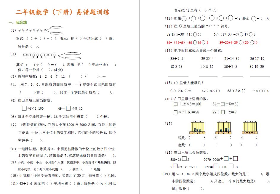 算式:( )÷( )=( ),表示:把( )平均分成( )份,每份是( )。