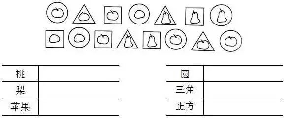 【问诊】本题容易出错的原因有两点:1.分类标准不明确,导致按不同标准对数据进行分类出现错误;2.收集、整理数据的过程出现遗漏现象。本题对图中事物进行分类整理,分类标准不同,得到的结果也不同。计算不同分类结果的合计数,利用计算结果检验分类结果是否正确(合计数应相同)。苹果比桃多2个,桃和梨一共有9个,苹果、桃和梨一共有15个,三种图形一共有15个。