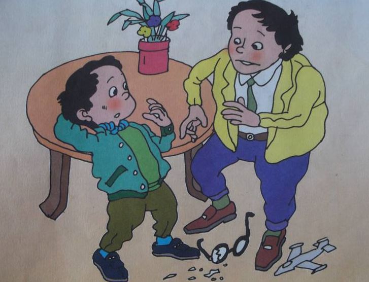 小明在家玩飞机玩具,因为跑来跑去,一眨眼没注意站在自己后面的爸爸,两个人就撞在了一起,小明的眼镜和飞机都掉在了地上,爸爸没注意一脚踩破了小明的眼镜。两个人都很不好意思,感到抱歉。